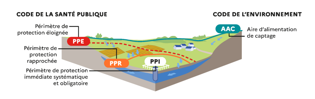 L’instauration de ces périmètres vise à protéger les points de prélèvement d’eau contre toutes les pollutions ponctuelles et accidentelles à minima. Ils doivent être inclus dans la demande d’autorisation d’utilisation d’eau en vue de la consommation humaine, font l’objet d’une enquête publique puis sont actés par un arrêté préfectoral de déclaration d’utilité publique (DUP).